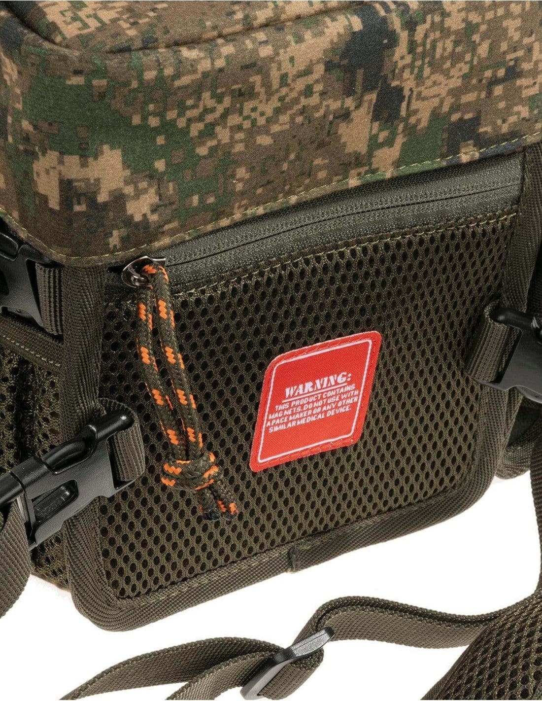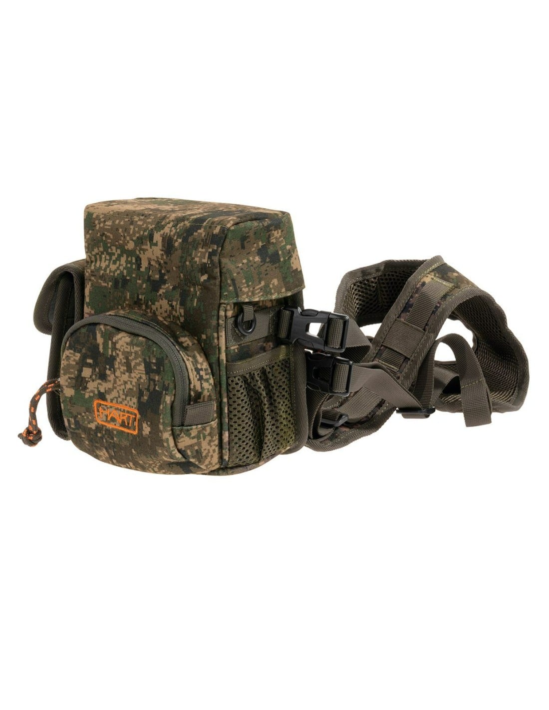 Внутренние регулируемые ремни и плотно закрывающаяся крышка футляра с магнитной застежкой обеспечивают идеальную защиту бинокля. Дополнительные передние и задние карманы на молнии, а также боковой радиочастотный кейс и точки крепления делают набор удобным для использования в любых условиях. В переднем кармане находится патронница. Боковой радиочастотный кейс обеспечивает надежную защиту дальномера и других электронных устройств.
